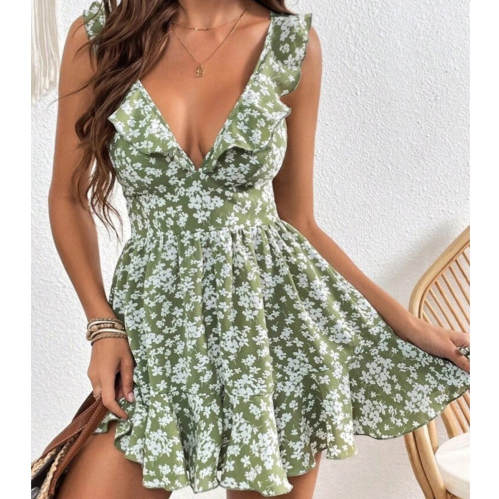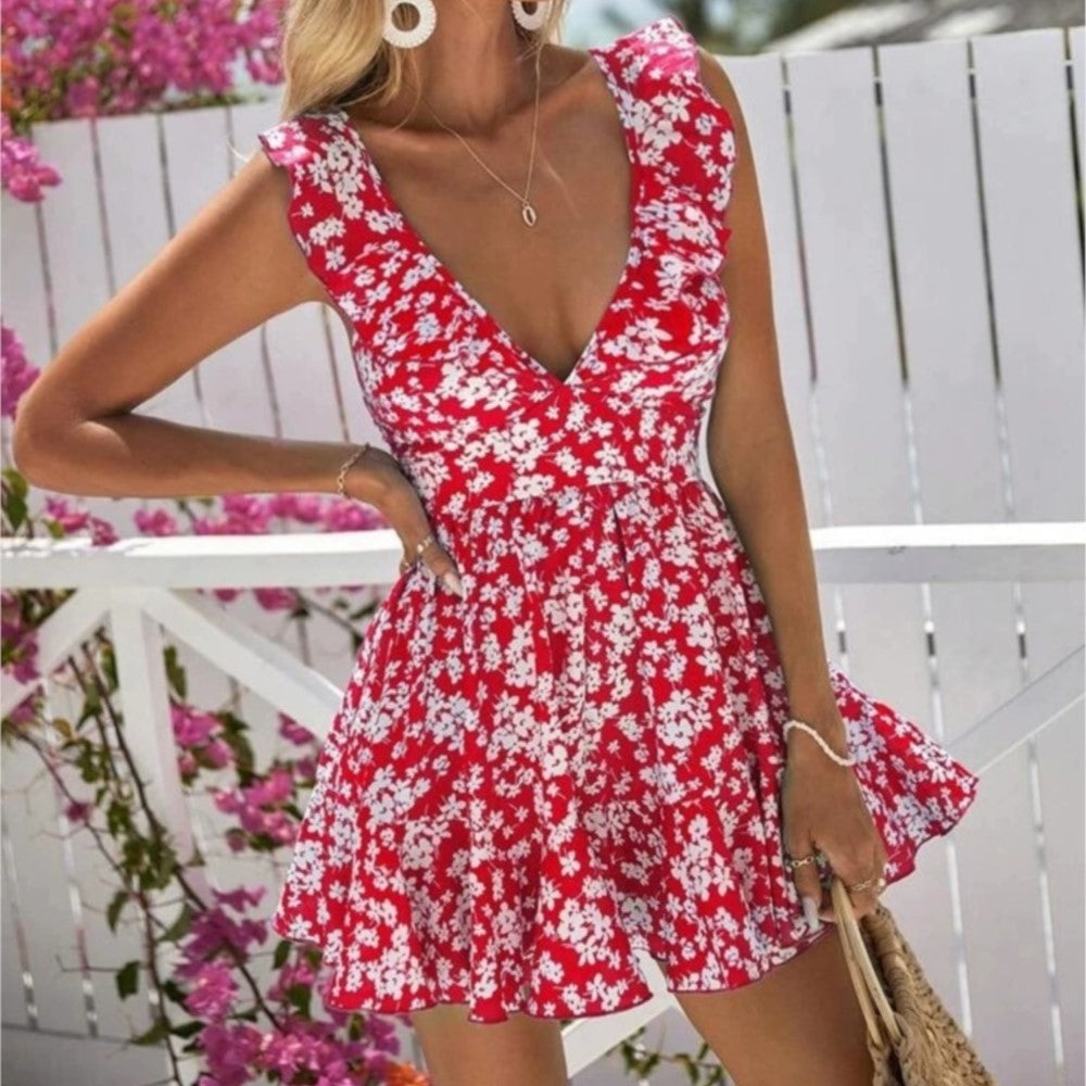 Dieses Kleid kombiniert ein schlichtes Design mit einem floralen Muster. Es ist für verschiedene Anlässe in der warmen Jahreszeit geeignet.