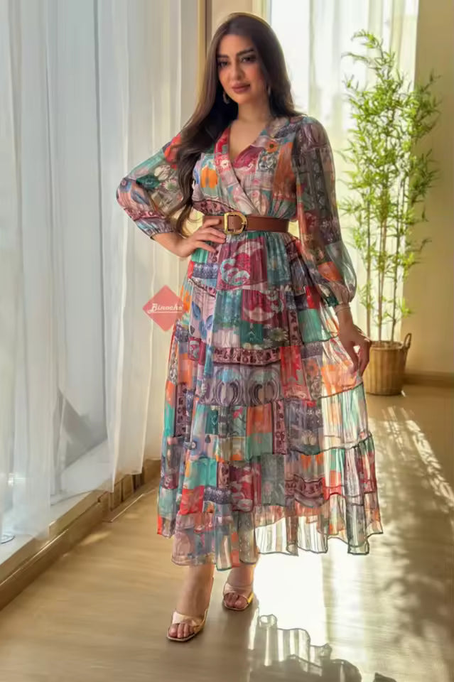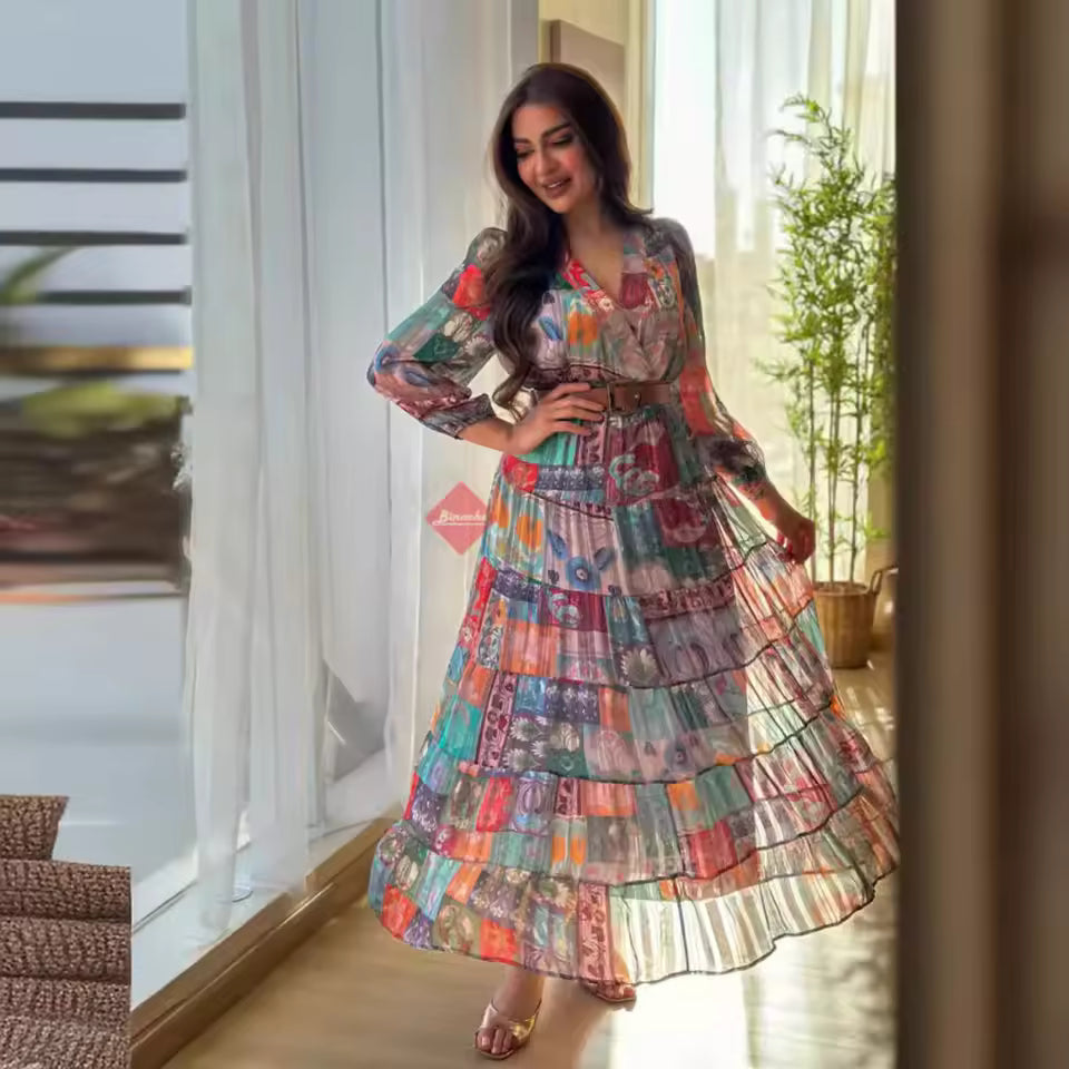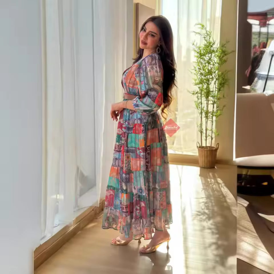 This abaya dress combines a full-length silhouette with a printed design. It is suitable for everyday wear and various occasions.